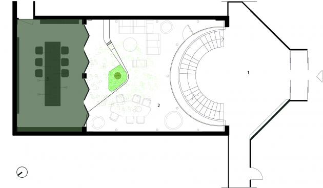 Il tavolo misura in pianta 450 x 110 cm ed è caratterizzato da due altezze differenti ( 75 e 110 cm) con due conseguenti modalità d'utilizzo: in piedi e seduti. La scelta di progettare un tavolo con altezze differenti nasce dal bisogno della committenza di poter svolgere non solo riunioni istituzionali ma anche più informali dove la parte alta del tavolo diventa a seconda dei casi un piano di lavoro, un podio o un banco bar.