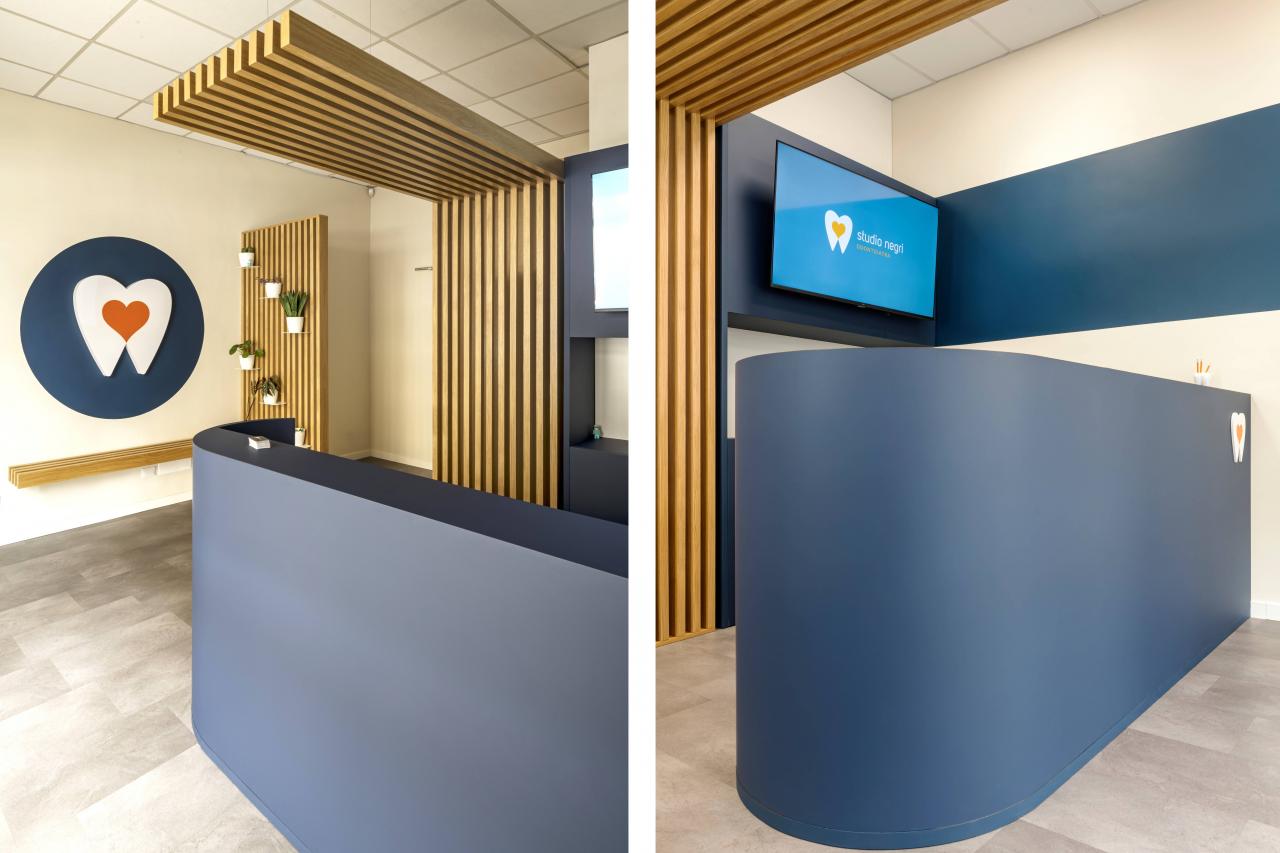 A destra del logo, di fronte all’entrata della clinica, il bancone accoglie i clienti dello studio dentistico; realizzato in Fenix, è caratterizzato da un blu notte intenso e da linee pulite e arrotondate.