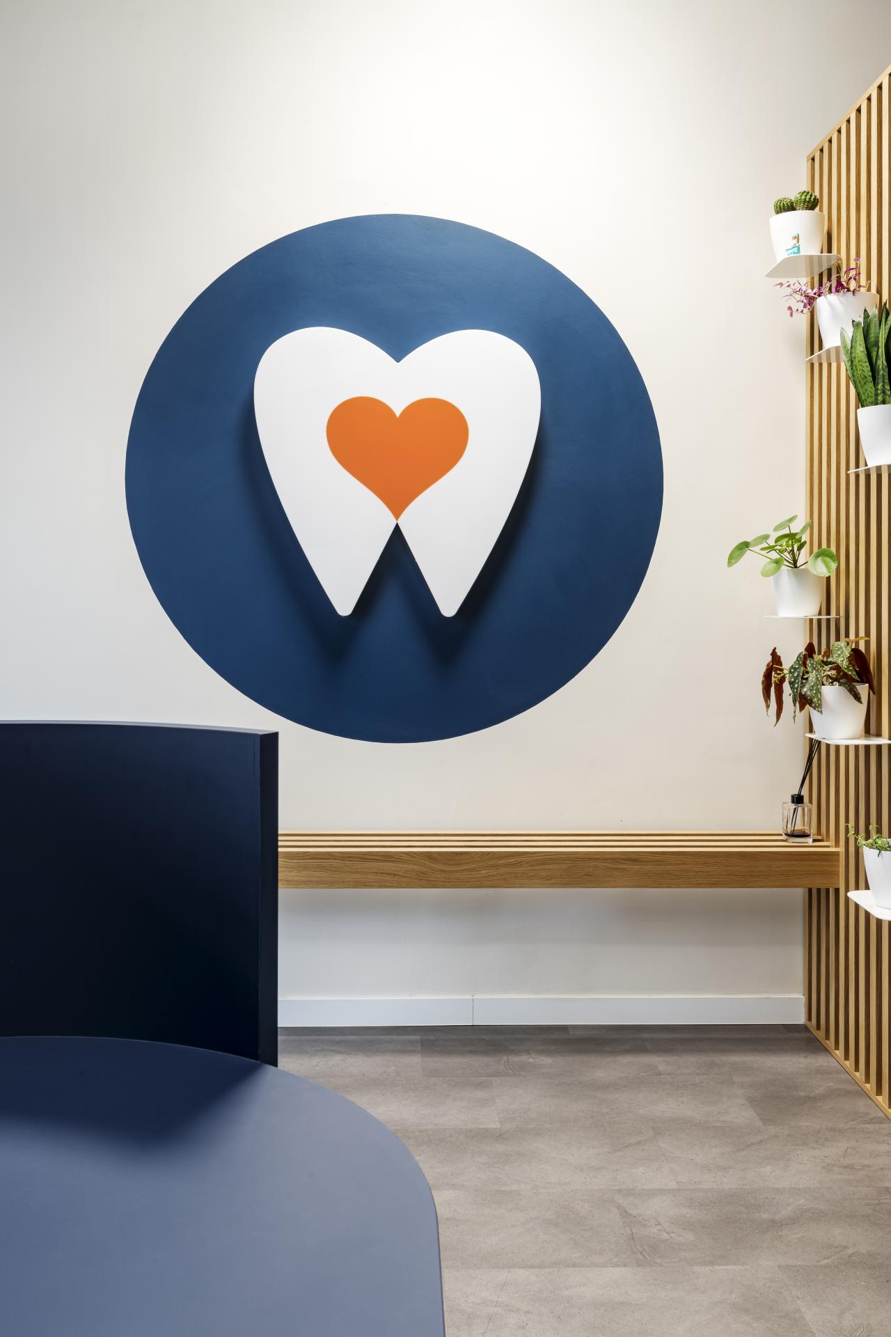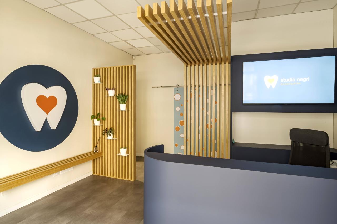 L’insegna interna, collocata sulla parete che separa la reception dalla sala d’attesa, riproduce il logo dello studio e diventa uno degli elementi identitari dello spazio.