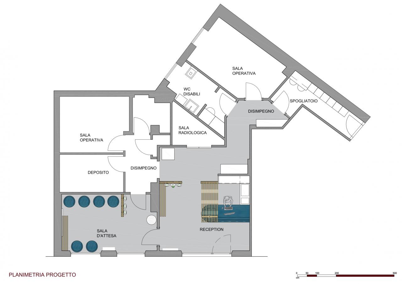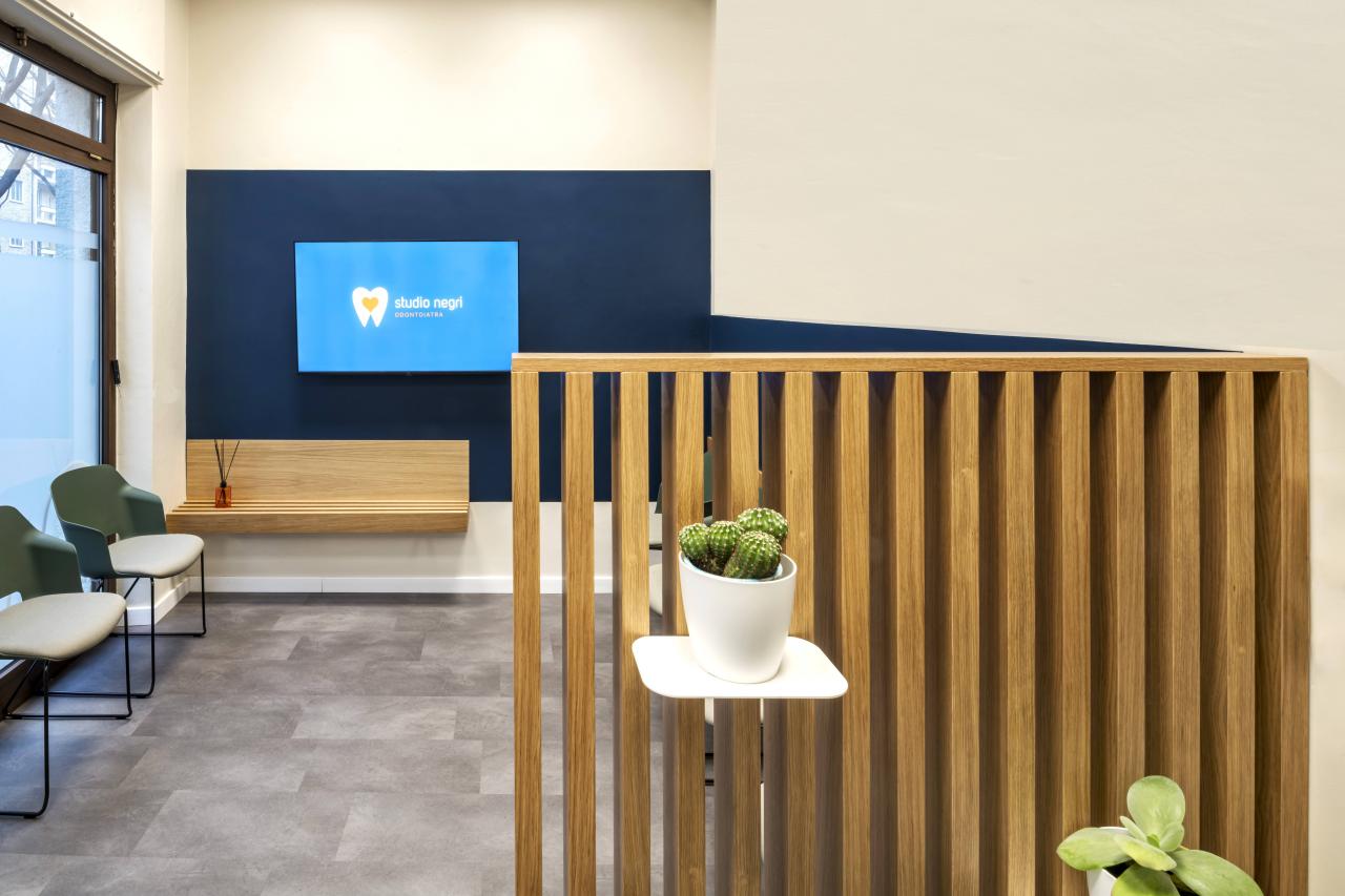 Completa l’intervento la sala d’attesa, caratterizzata anch’essa da cromie blu notte alle pareti e da strutture separé in legno.