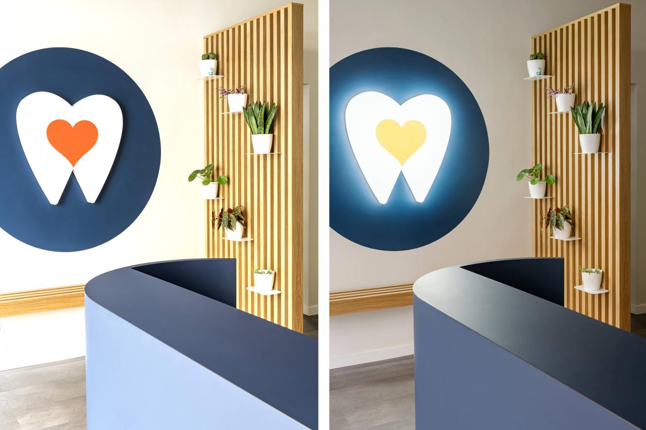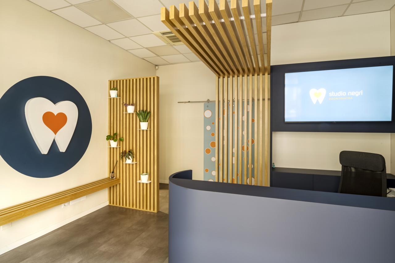 L’insegna interna, collocata sulla parete che separa la reception dalla sala d’attesa, riproduce il logo dello studio e diventa uno degli elementi identitari dello spazio.