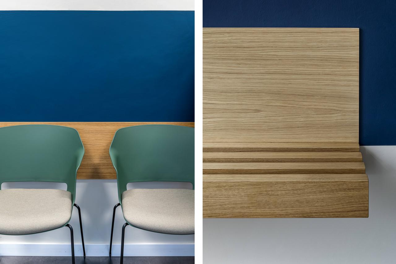 Completa l’intervento la sala d’attesa, caratterizzata anch’essa da cromie blu notte alle pareti e da strutture separé in legno.
