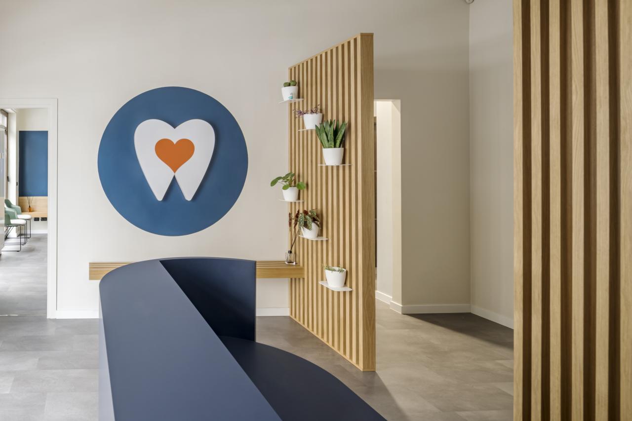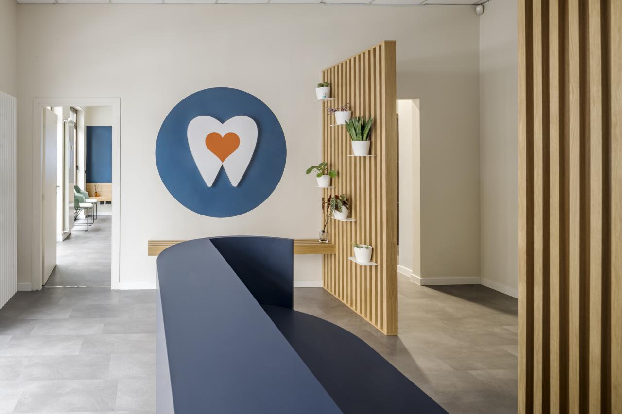 A destra del logo, di fronte all’entrata della clinica, il bancone accoglie i clienti dello studio dentistico; realizzato in Fenix, è caratterizzato da un blu notte intenso e da linee pulite e arrotondate.