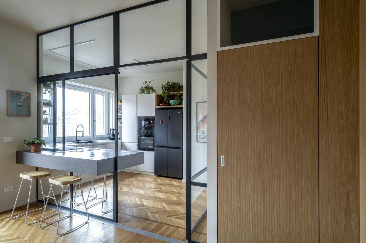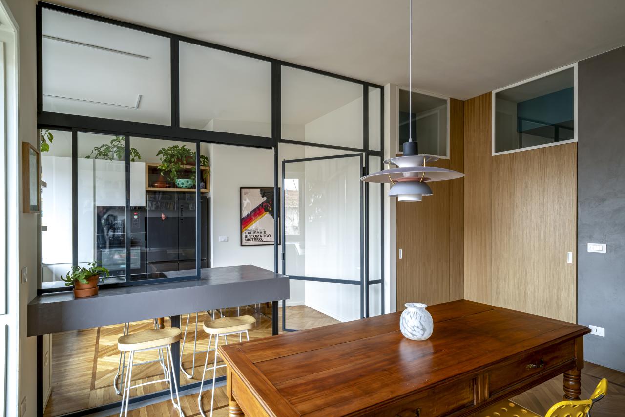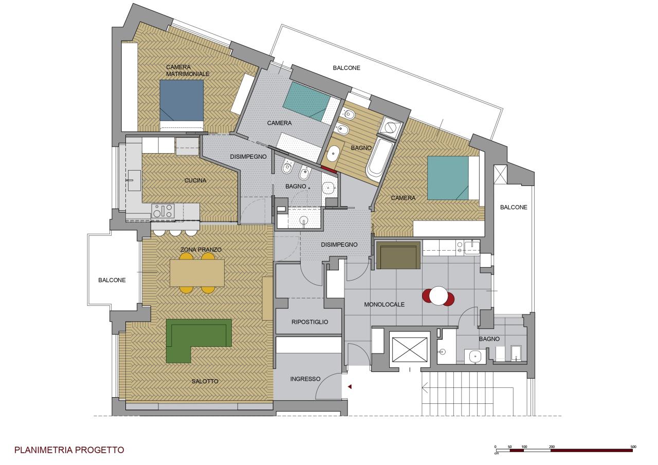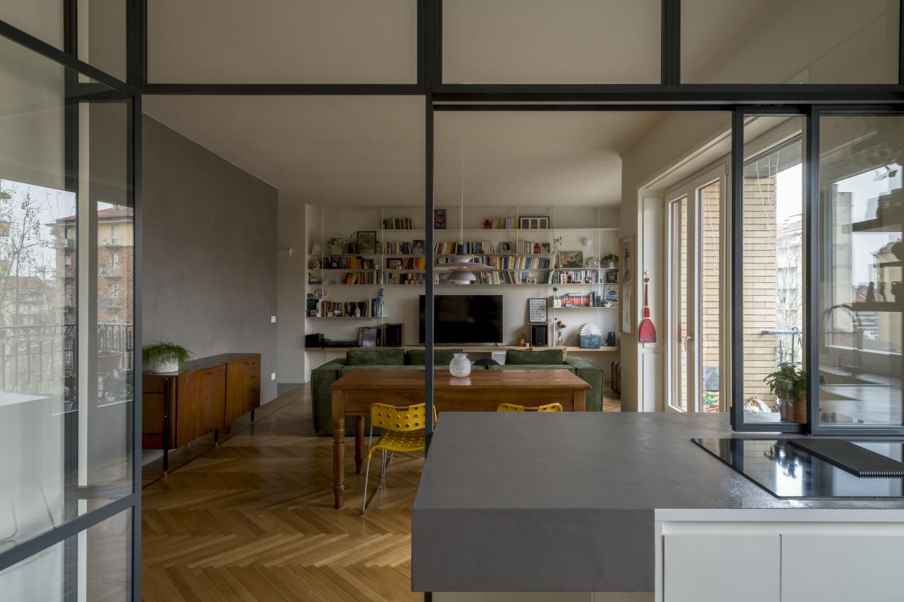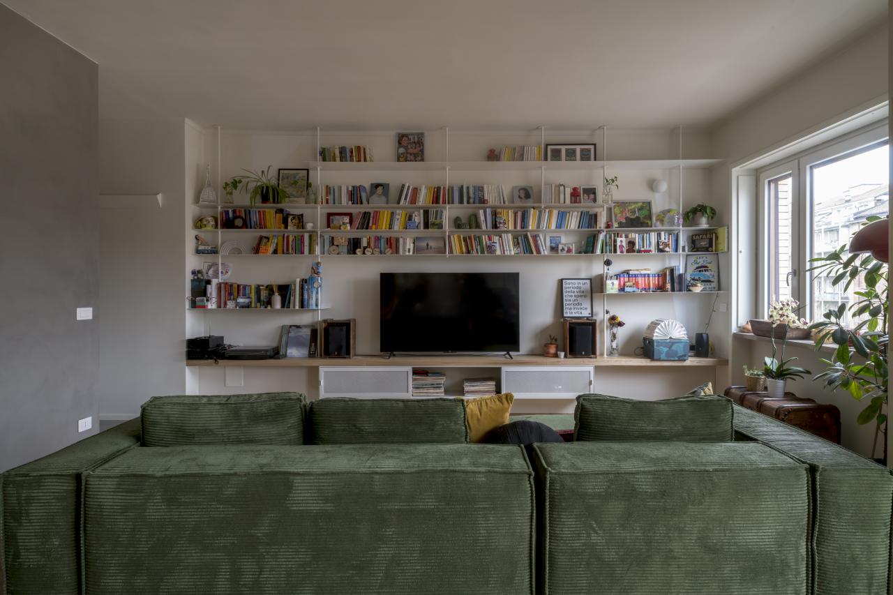 L'alloggio, prima dell'intervento era composto da un grande salotto, cucina, due camere, due bagni e spazi distributivi troppo grandi e mal pensati. La richiesta della committenza era di poter mantenere il grande salotto, anzi, se possibile, ingrandirlo accorpando una cucina a vista, ricavare tre stanze, due bagni, un grande ripostiglio e sfruttare il secondo accesso all'abitazione per ricavare un monolocale con bagno. Limando e riprovando ci siamo riusciti.