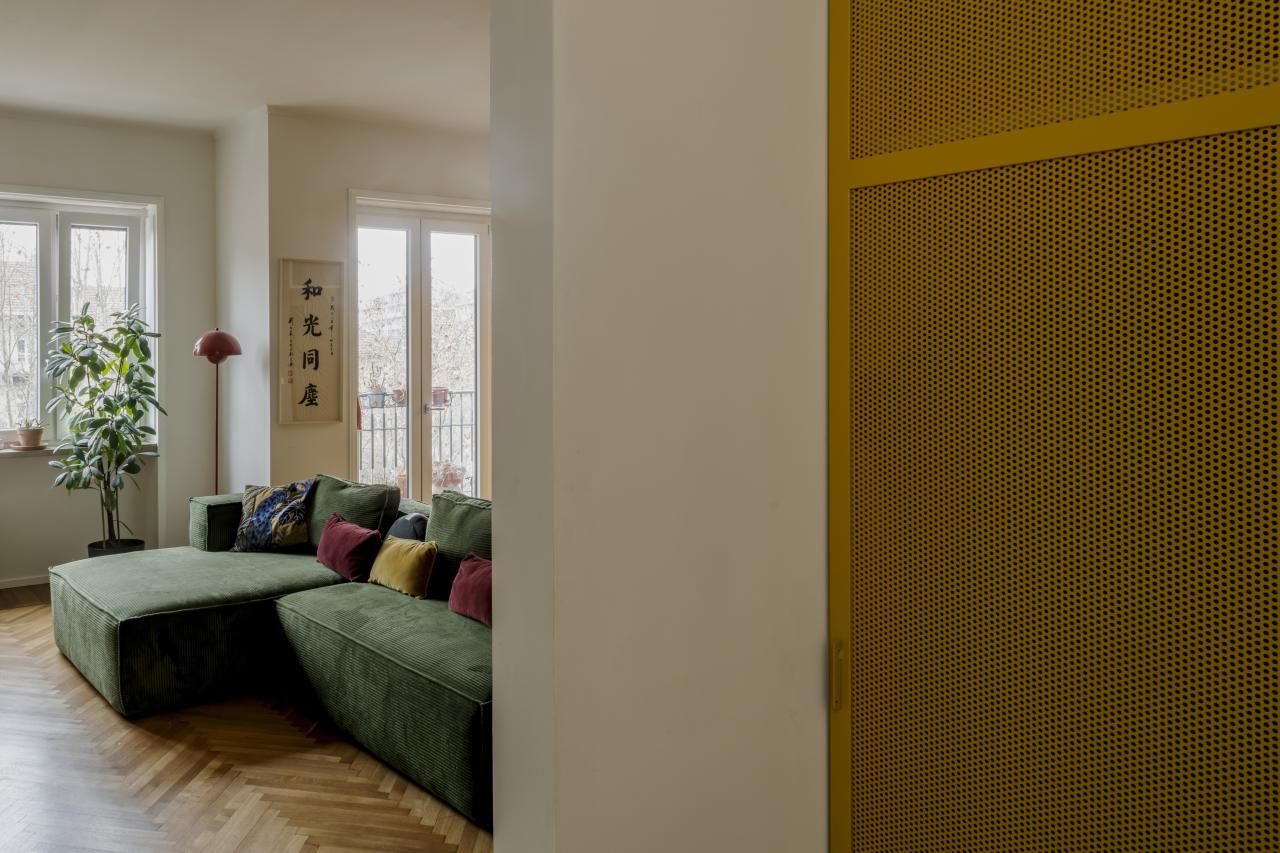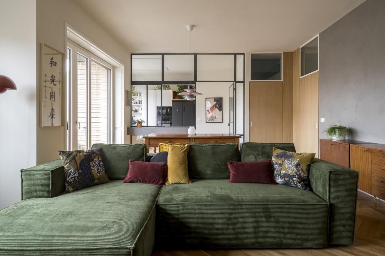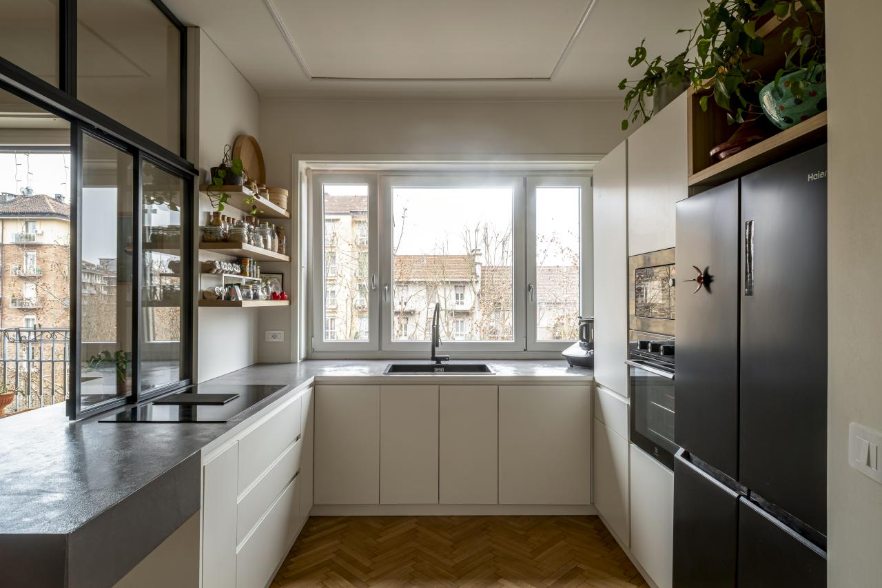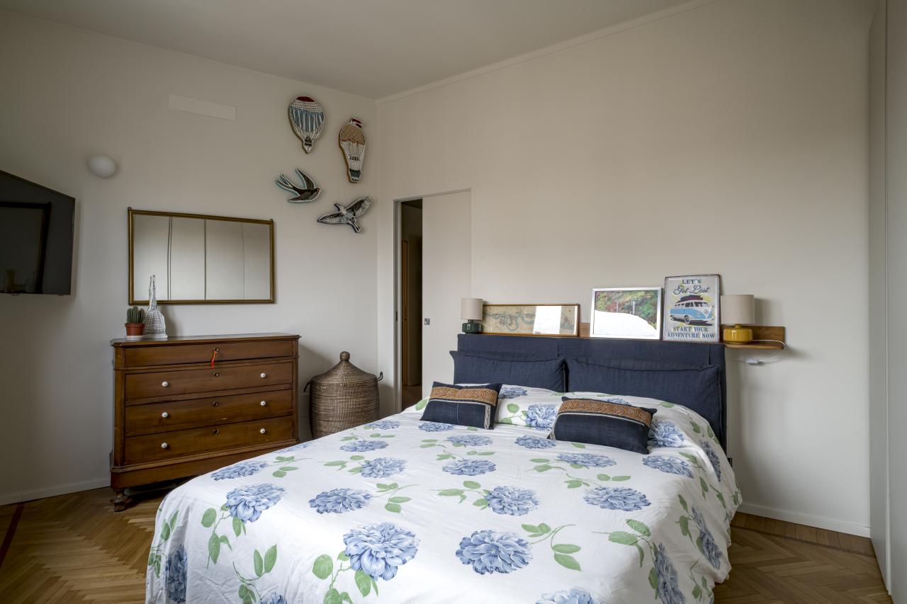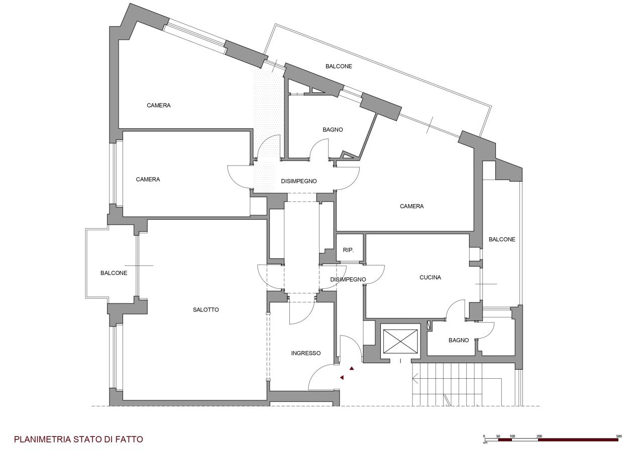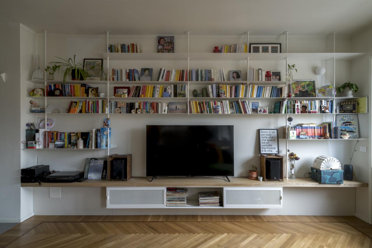 L'alloggio, prima dell'intervento era composto da un grande salotto, cucina, due camere, due bagni e spazi distributivi troppo grandi e mal pensati. La richiesta della committenza era di poter mantenere il grande salotto, anzi, se possibile, ingrandirlo accorpando una cucina a vista, ricavare tre stanze, due bagni, un grande ripostiglio e sfruttare il secondo accesso all'abitazione per ricavare un monolocale con bagno. Limando e riprovando ci siamo riusciti.