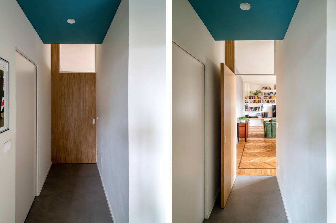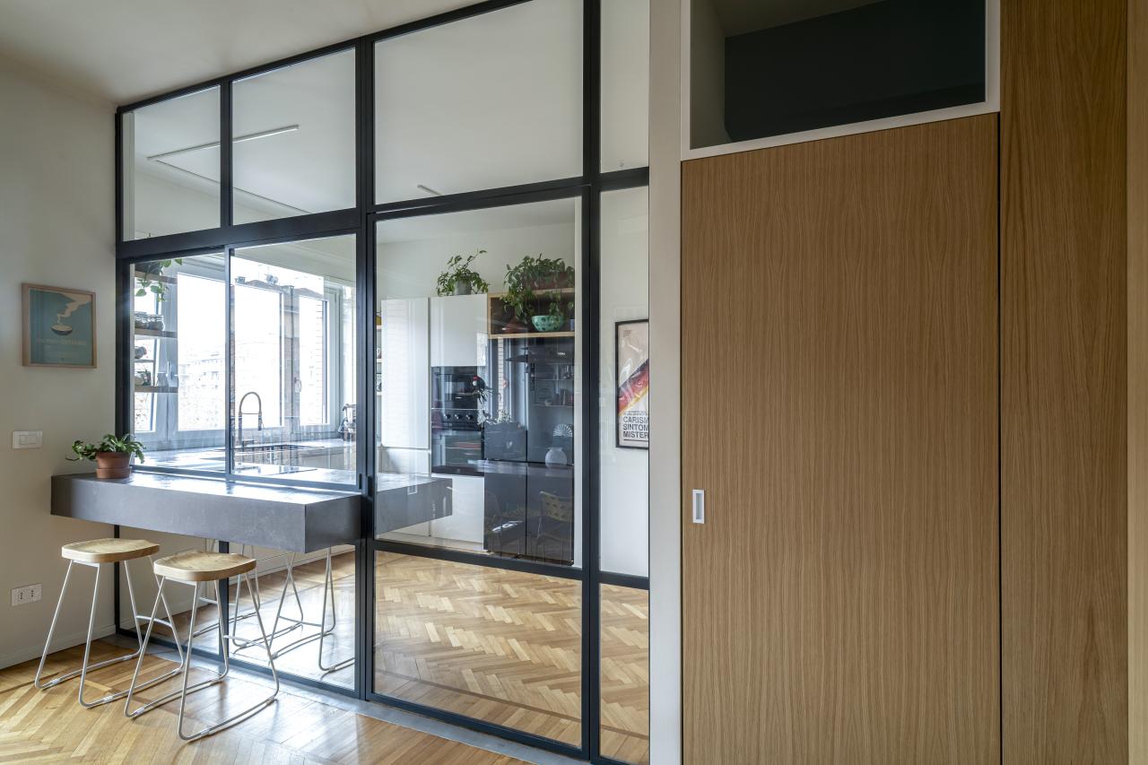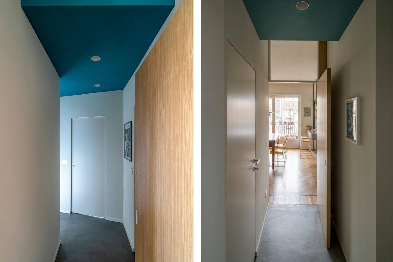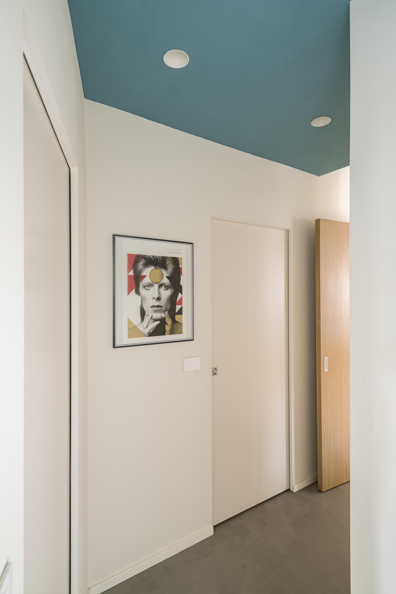 Gli elementi che connotano maggiormente il progetto sono: nella zona giorno la grande e luminosa cucina a vista protetta da un'ampia parete vetrata, la libreria sospesa in metallo disegnata su misura, le grandi porte in rovere da cui si accede ai corridoi della zona notte: a loro volta connotati dal soffitto azzurro e dai camminamenti in microcemento; finitura che ritroviamo anche nella grande parete del soggiorno e nei due bagni.