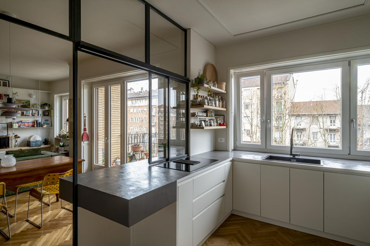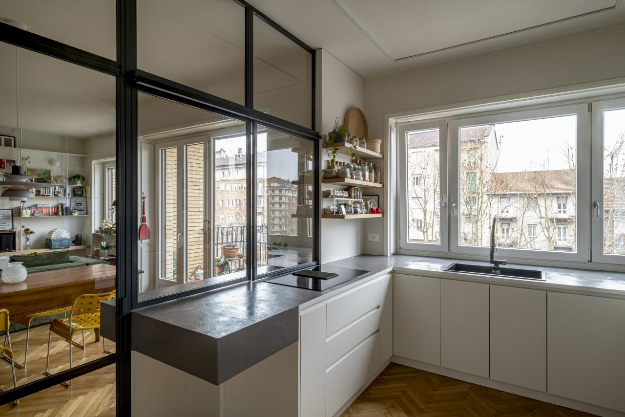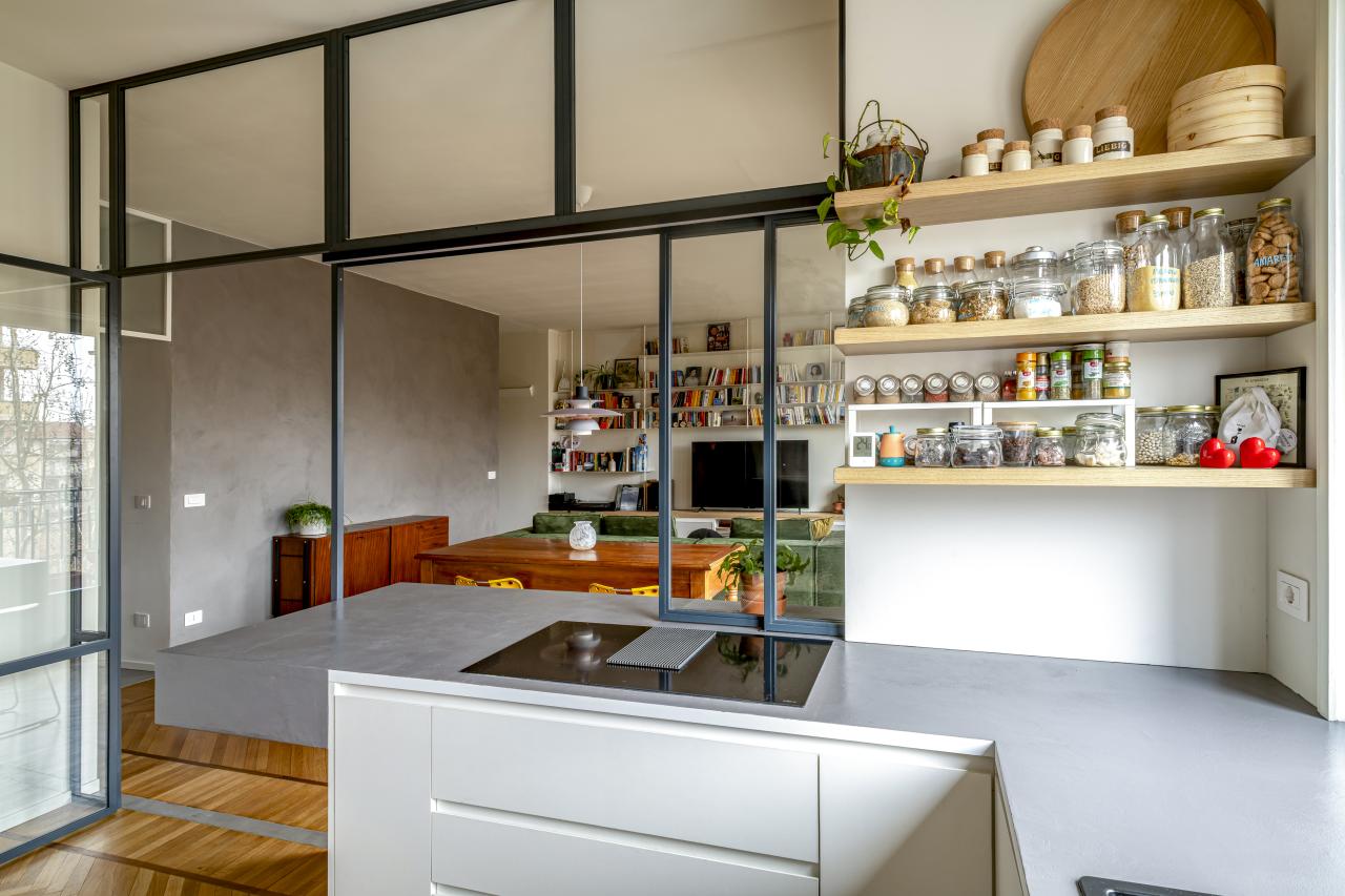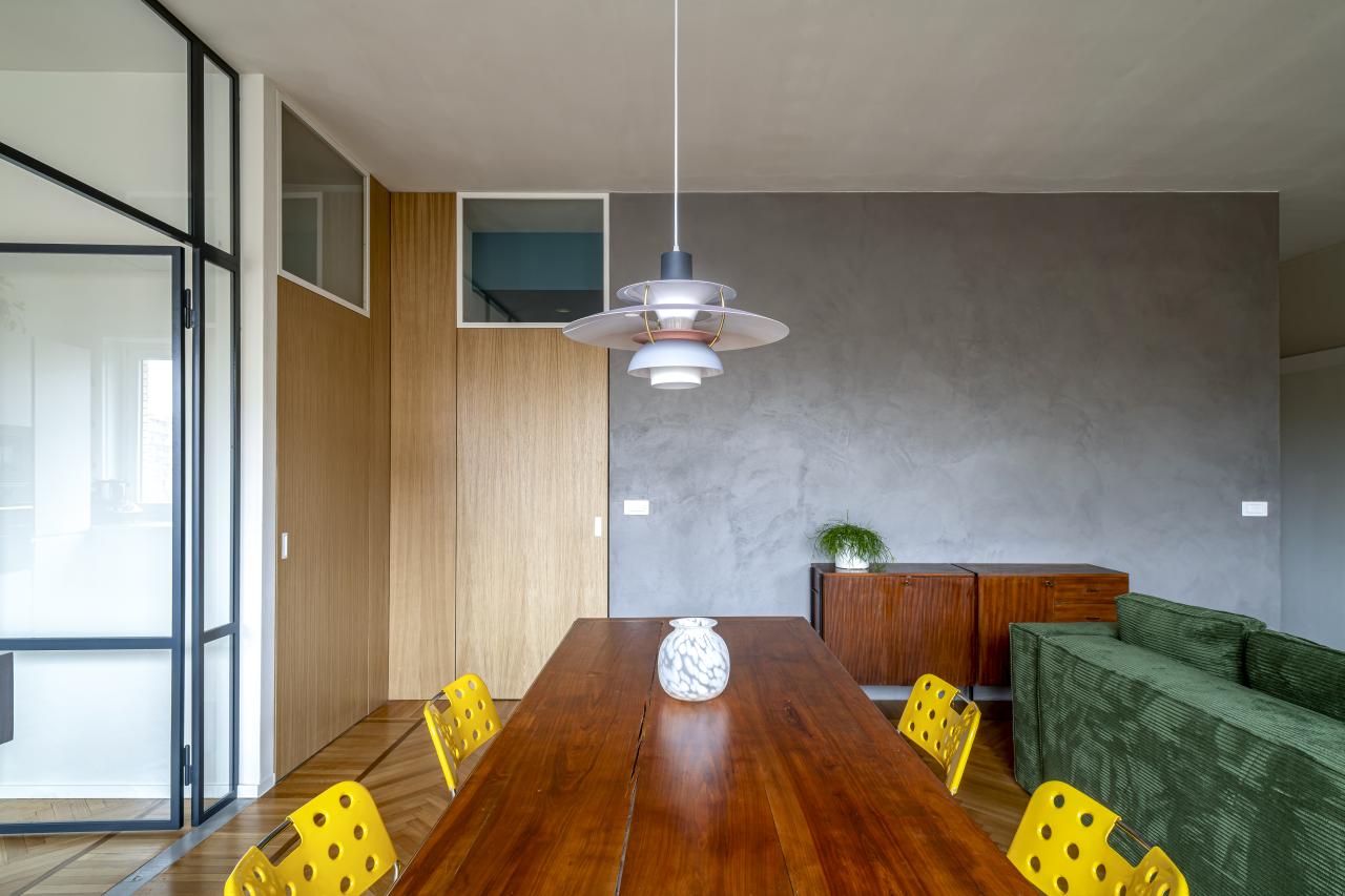 Gli elementi che connotano maggiormente il progetto sono: nella zona giorno la grande e luminosa cucina a vista protetta da un'ampia parete vetrata, la libreria sospesa in metallo disegnata su misura, le grandi porte in rovere da cui si accede ai corridoi della zona notte: a loro volta connotati dal soffitto azzurro e dai camminamenti in microcemento; finitura che ritroviamo anche nella grande parete del soggiorno e nei due bagni.