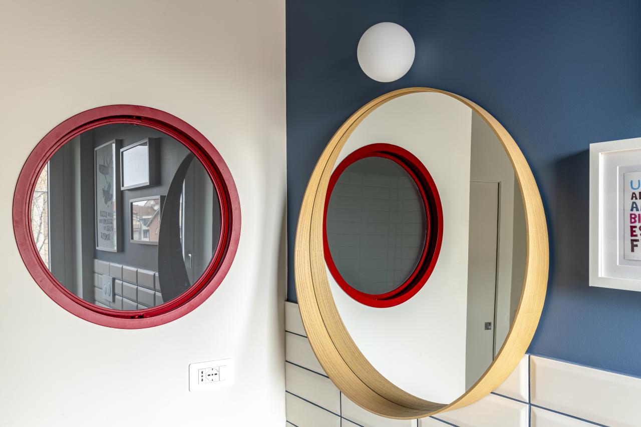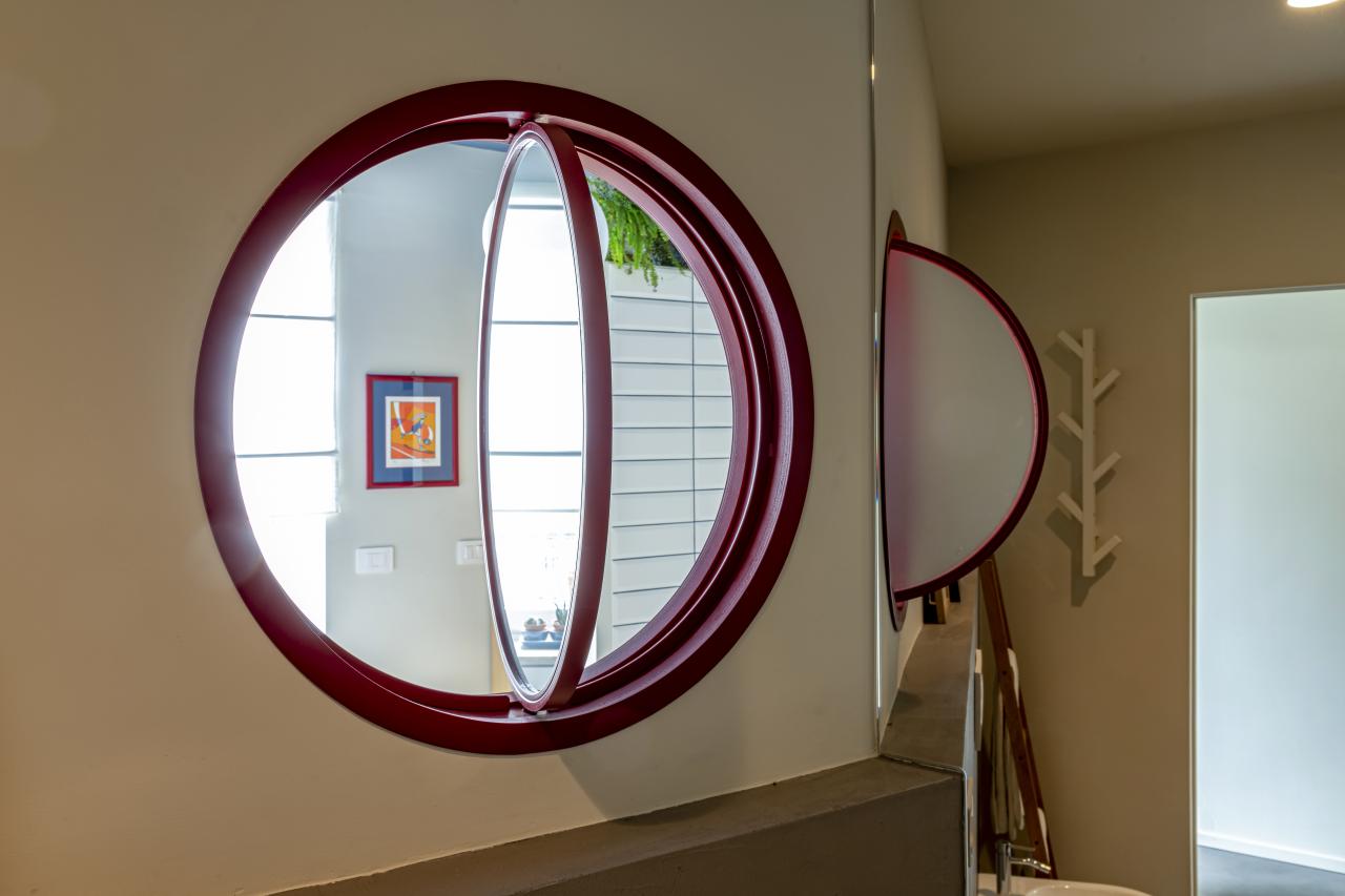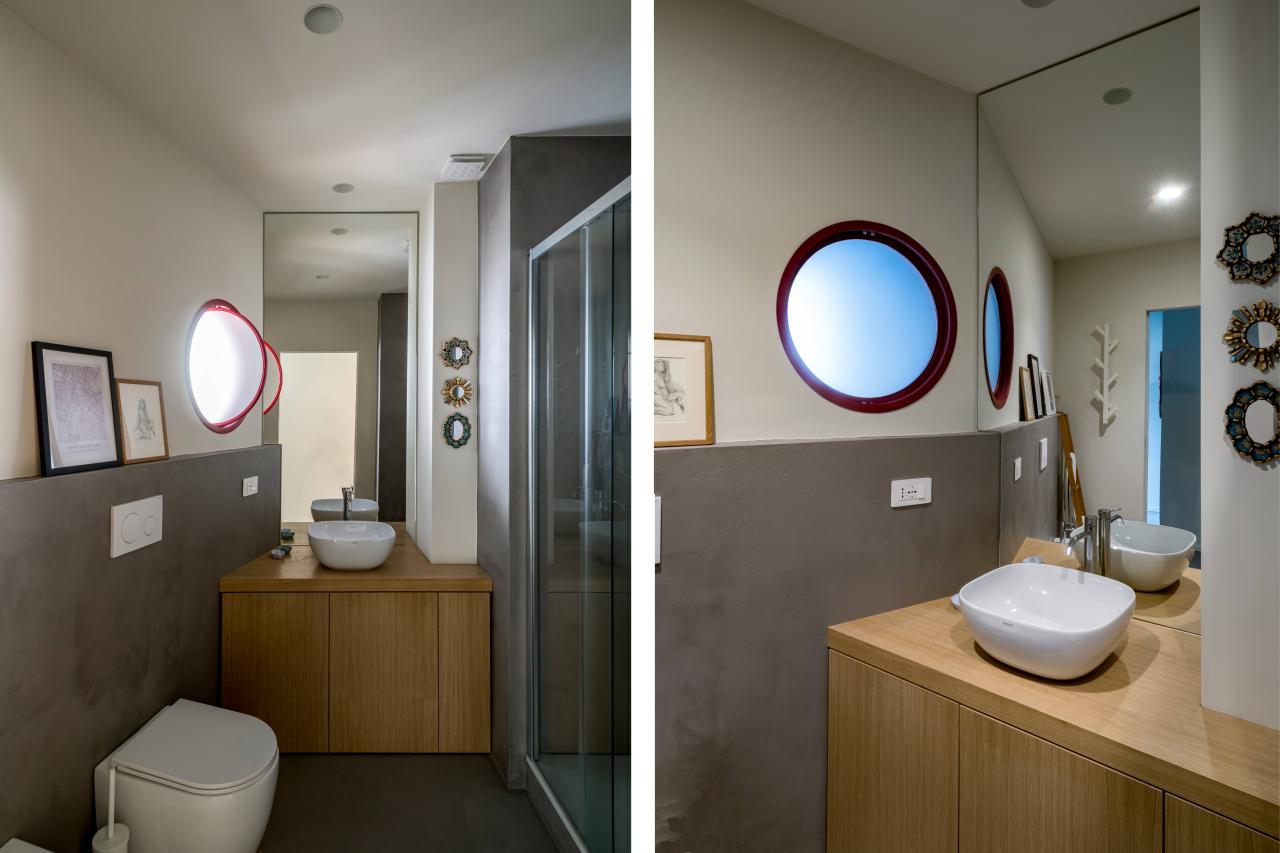 I bagni sono caratterizzati da un oblò comunicante e apribile che permette non solo al bagno cieco di avere luce ed areazione naturale, ma connota esteticamente l'insieme creando un gioco di rimandi tra specchi ed l'oblò.