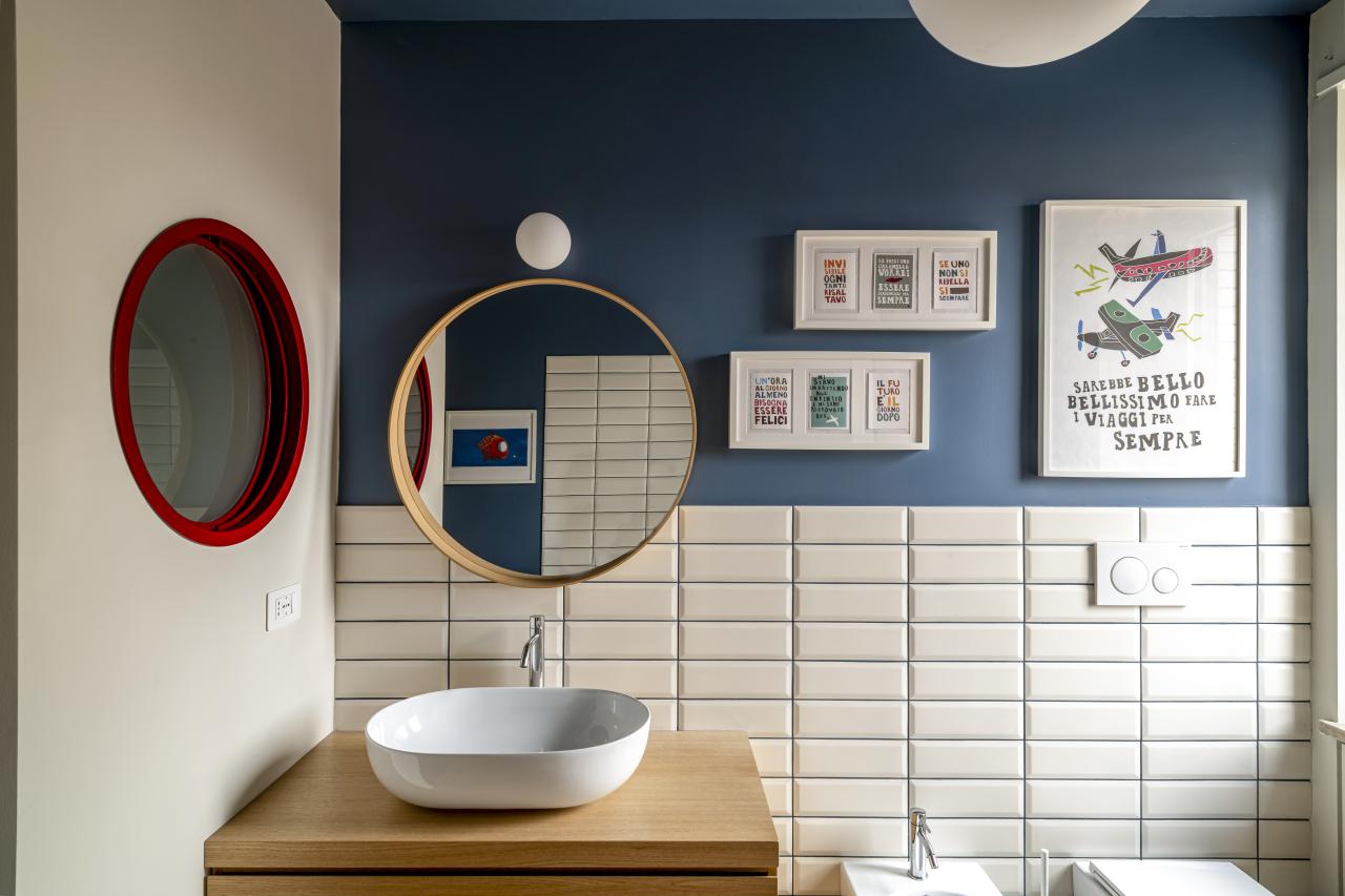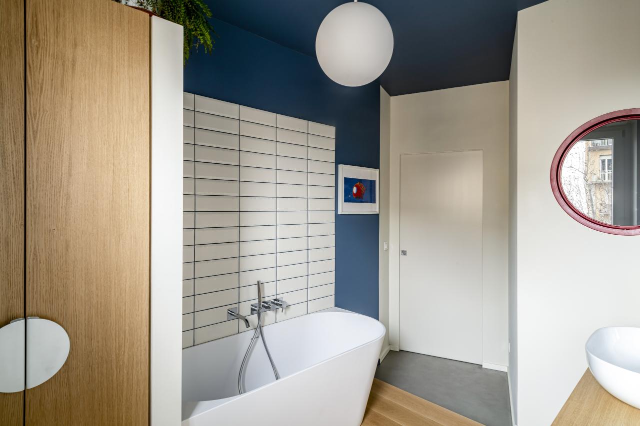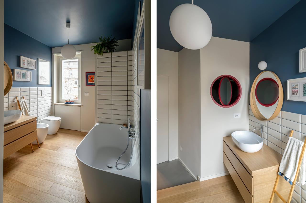 I bagni sono caratterizzati da un oblò comunicante e apribile che permette non solo al bagno cieco di avere luce ed areazione naturale, ma connota esteticamente l'insieme creando un gioco di rimandi tra specchi ed l'oblò.